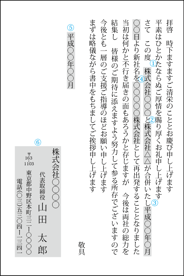 会社合併時、合併による新会社発足時の挨拶状文例テンプレートです。